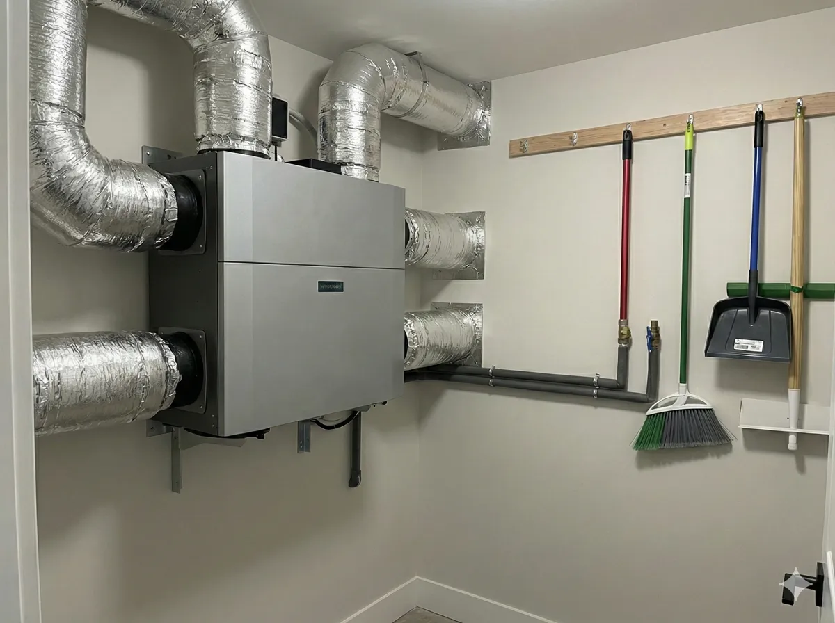 Plămânii Casei (Ventilație): Am integrat o unitate de Ventilație cu Recuperare de Căldură (HRV) de înaltă eficiență. Aceasta extrage continuu aerul viciat din băi și bucătărie și introduce aer proaspăt, filtrat de poluanți și praf, în dormitoare și living, recuperând peste 90% din căldură.
